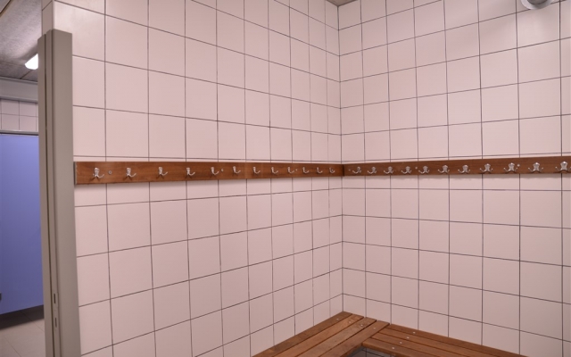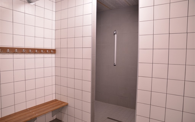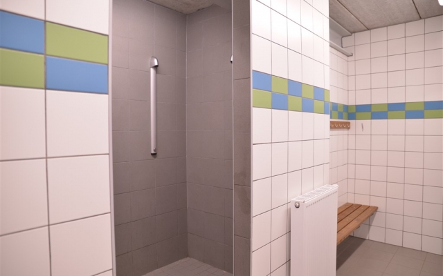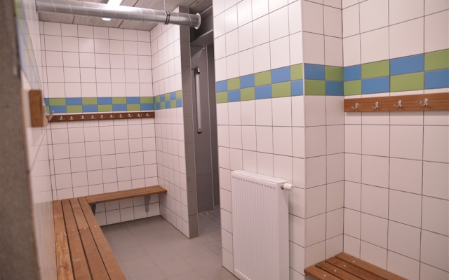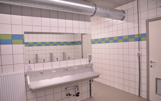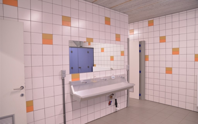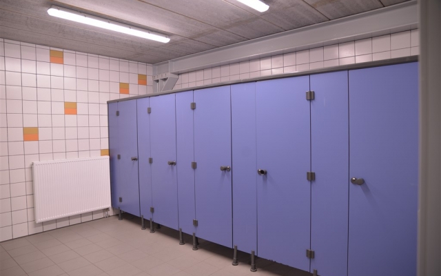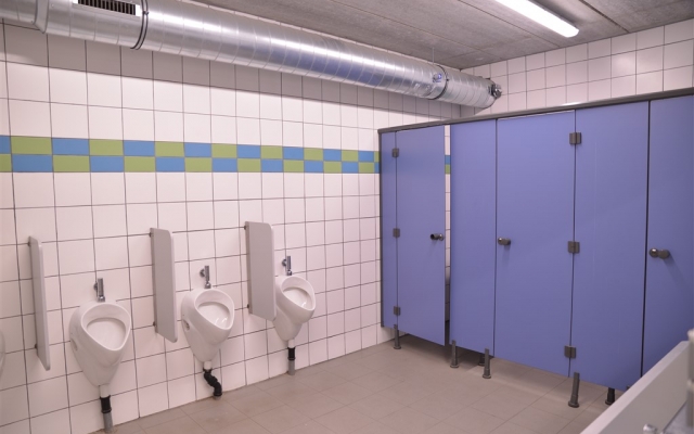 Sanitair heren: 3 toiletten, 4 staantoiletten, 5 douches