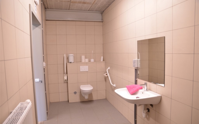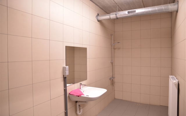 Sanitair invalide: grote ruimte met toilet, douche en aangepaste wastafel.